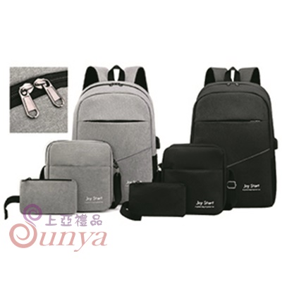 規格:(背包)寬30X高46X厚12cm (側背包)寬20X高22X厚5cm (拉鍊包)17X11cm 材質:牛津布 彩盒裝